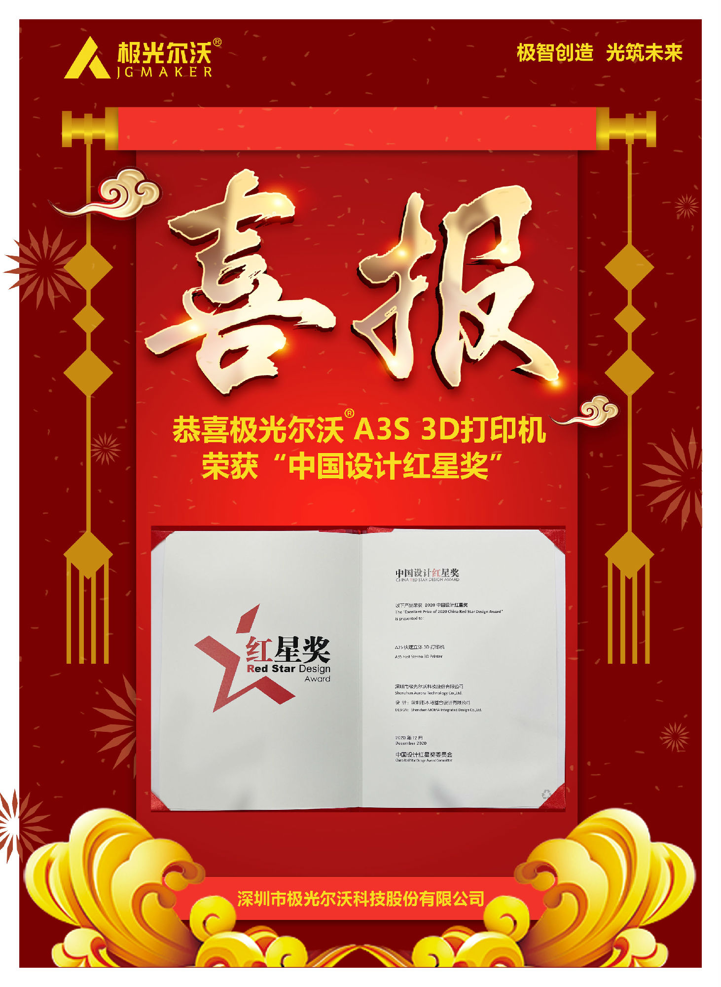 12月9日,2020中国设计红星奖颁奖活动在北京举行。2020年中国设计红星奖以"融合的时代 凝聚的力量"为主题,来自全球5000家企业的7000余件产品参与角逐极光尔沃A3S 3D打印机凭借新颖独特的设计理念、简洁纯粹的产品形象从众多产品中脱颖而出,获得评委一致青睐,一举拿下2020中国设计红星奖。