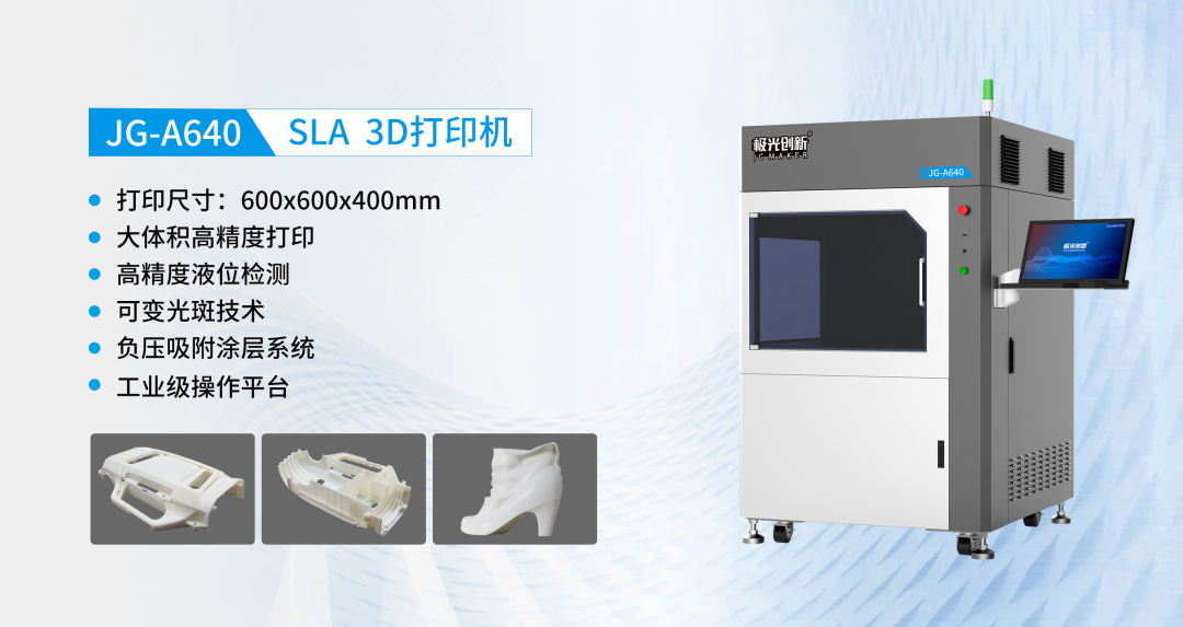 在展位上宣传展示的一系列产品中,极光创新王牌级产品JG-A640工业级光固化3D打印机当仁不让占领C位,JG-A640依据其大体积、高精度、低成本的特点,更大限度的提高了生产率和灵活度,高达0.05m的精度等级,可制作各种结构复杂的精密零件和组装件