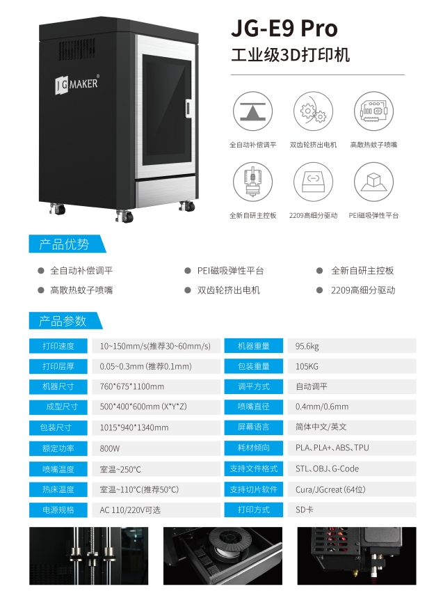 极光创新JG-E9 Pro作为极光创新工业级FDM系列3D打印机的王牌产品,在教育科研、工业制造等领域深受好评,除了拥有500*400*600mm的较大成型尺寸之外,全封闭空间的钣金结构机身,不仅可以很好的控制机箱温度,有效提升打印精度。同时,该款机器的内置配置也是直接拉满,集成化设备管理系统、先进的热感控制系统、四轴静音驱动主板、大流量高散热蚊子喷头等齐全的内核配置,全方位保障3D打印模型的成型率。