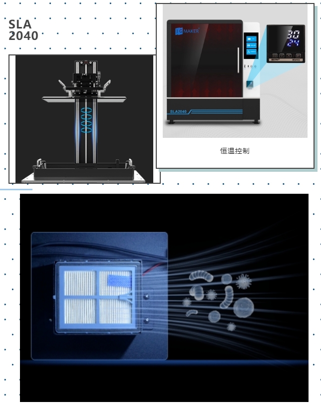 伺服电机控制系统搭配的精密滚珠丝杆,有效降低打印过程中产生的噪音,真正实现静音打印。同时,SLA 2040还内置了多层空气过滤网,有效净化打印环境和料池树脂异味,让打印环境更舒适干净!
