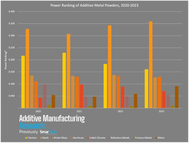 在评估金属粉末市场时,平衡增长和销量等因素非常重要。为了正确比较金属材料对整个3D打印市场的重要性,AMR制定了一套实力排名的方式,最终将数据标准化以进行跨年比较。从 AMR 最新的实力排名图表中,我们可以发现: