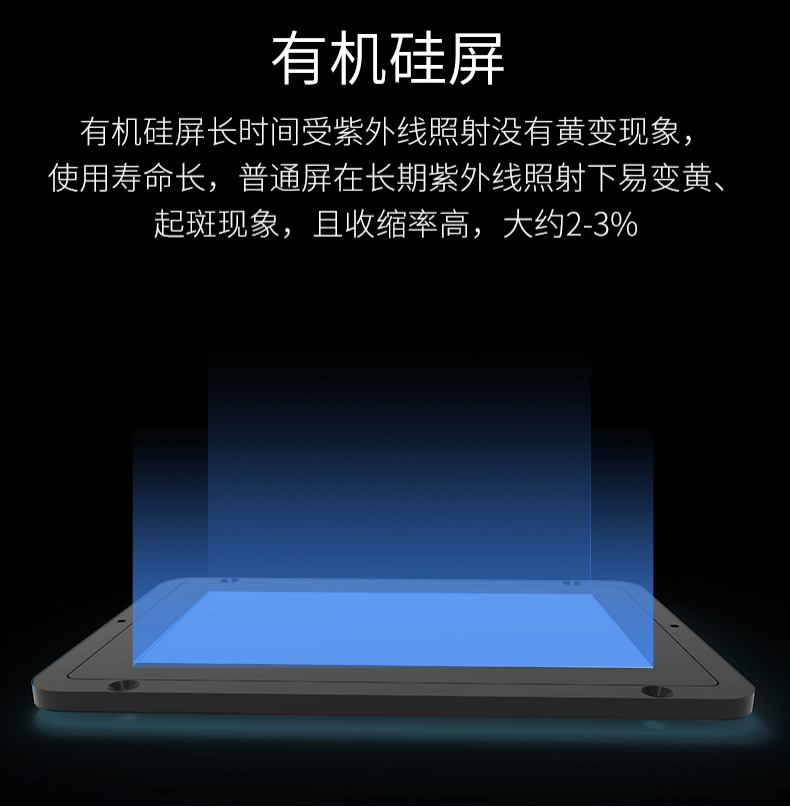 LCD屏幕在我们的生活中,是十分易见,我们的电脑屏幕,手机屏幕,平板电脑屏幕大多都是采用LCD屏幕,我们把这类屏幕归类民用生活,因为更高的性价比,量产较为简单,所以生活中大多都是普通LCD屏。那既然有普及的LCD屏,当然也有高精工业级别的LCD屏,工业控制屏行业相对常见的屏幕,制造的难度及标准都要高一个级别,工控行业LCD屏幕在长时间耐高温及紫外光照射下,素质要比我们常见的屏幕要更好,不易发黄,起斑的情况的出现。市场上的打印机已经普及主流到了5.5英寸2K屏,这次极光尔沃采用5.8英寸1080P屏幕,从参数上观察,2K是比1080P要好,因为纵向多了360个像素点,达到了1080P的三分之一还要多,极光尔沃这次是否真的打错算盘了呢,其实认真思考,并不是,在市场上LCD光固化打印机的5.5英寸2K屏都是某个厂商大量供货,而高精工控行业5.8英寸固化显示屏,市场上很少厂商在制造,因为工艺难度及成本控制,让厂商利润大大降低,换句话说,5.8英寸显示固化屏,在市场上市比较少见,用的也不多,但相对常见的5.5英寸2K屏幕,工控5.8英寸屏质量及寿命是另一个层次的级别。极光尔沃G3光固化打印机综合使用体验,选用了此款高性能的固化屏,延长用户使用打印机的时间,让用户更少的维护更换固化屏幕,极光尔沃对屏幕还进行了3个月正常使用质保服务保障。