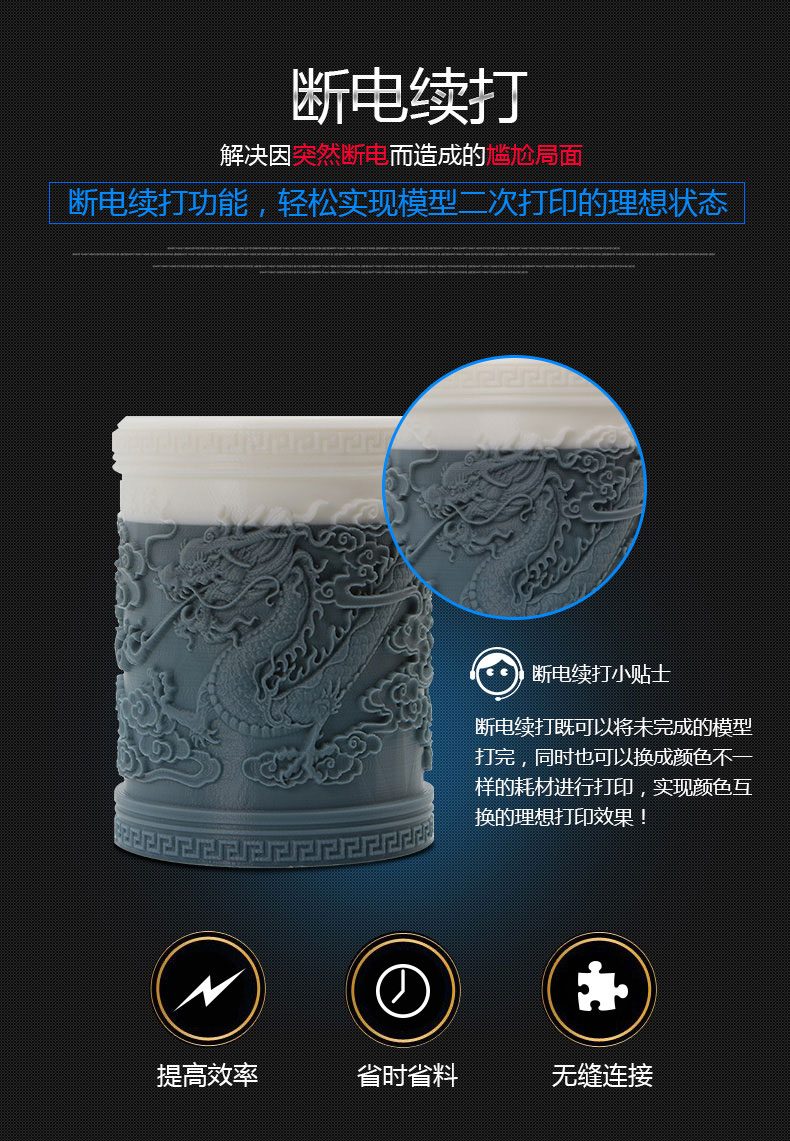 全球首创双电机传动送料结构,并配备高品质德国进口配件,打印精度媲美艺术品,这是一款追求“精确、精密、精致”的3D打印机。