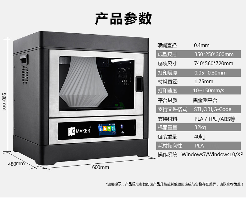 支持文件格式:STL, OBJ、 G-Code机器尺寸:590*460*600mm