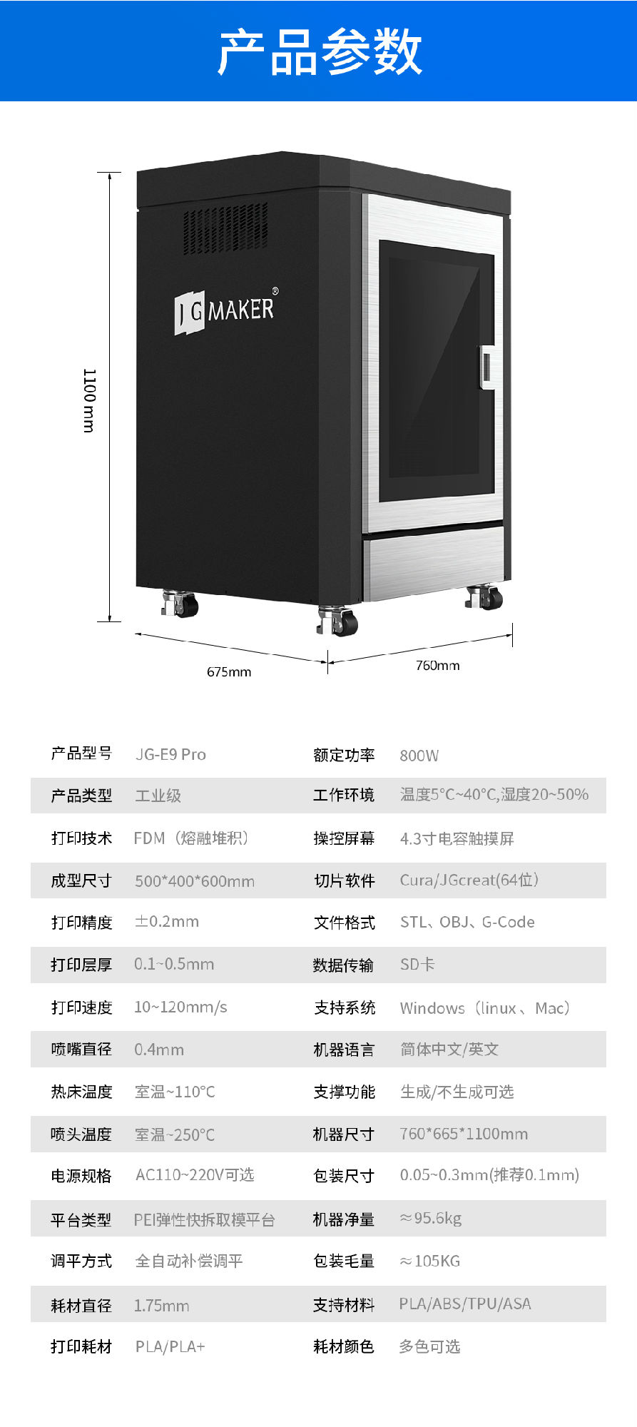 支持文件格式:STL, OBJ、 G-Code机器尺寸:760*665*1100mm