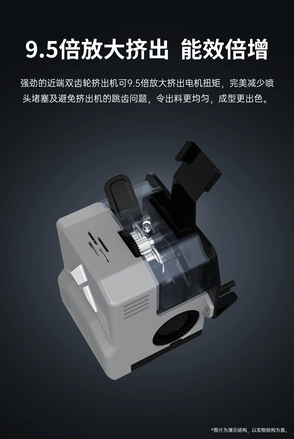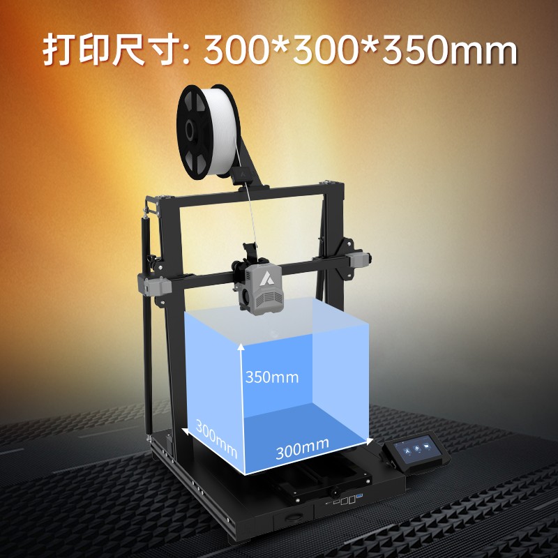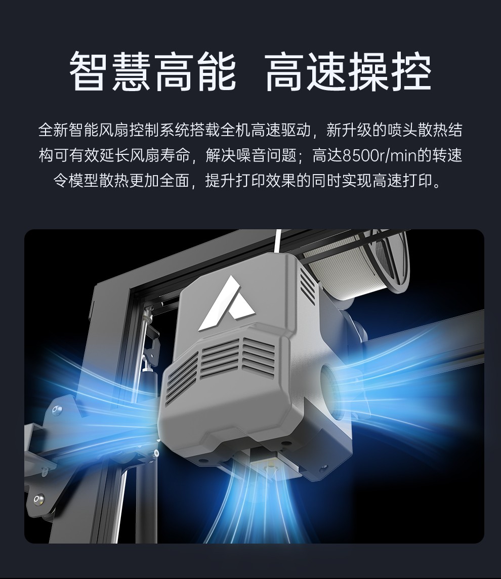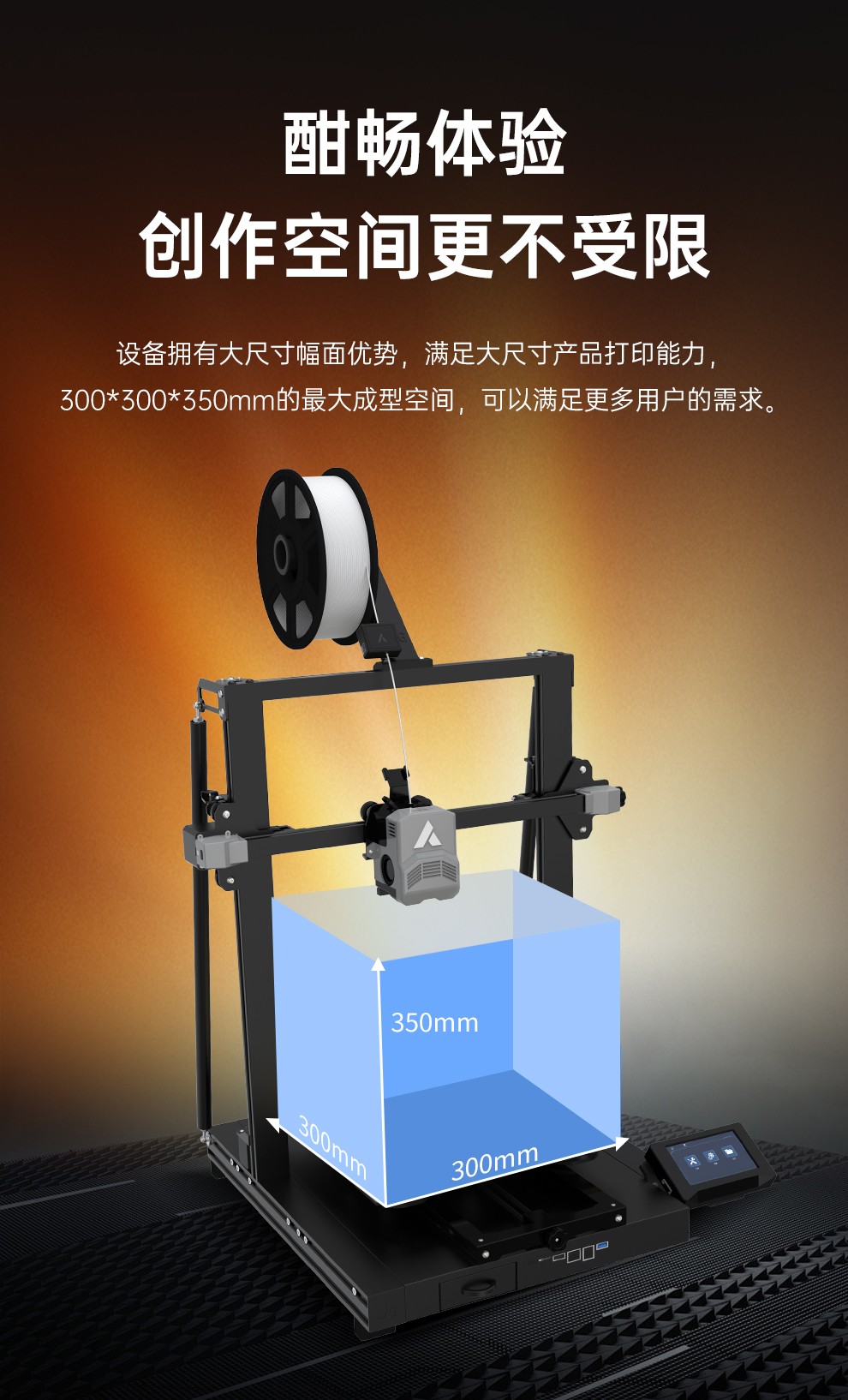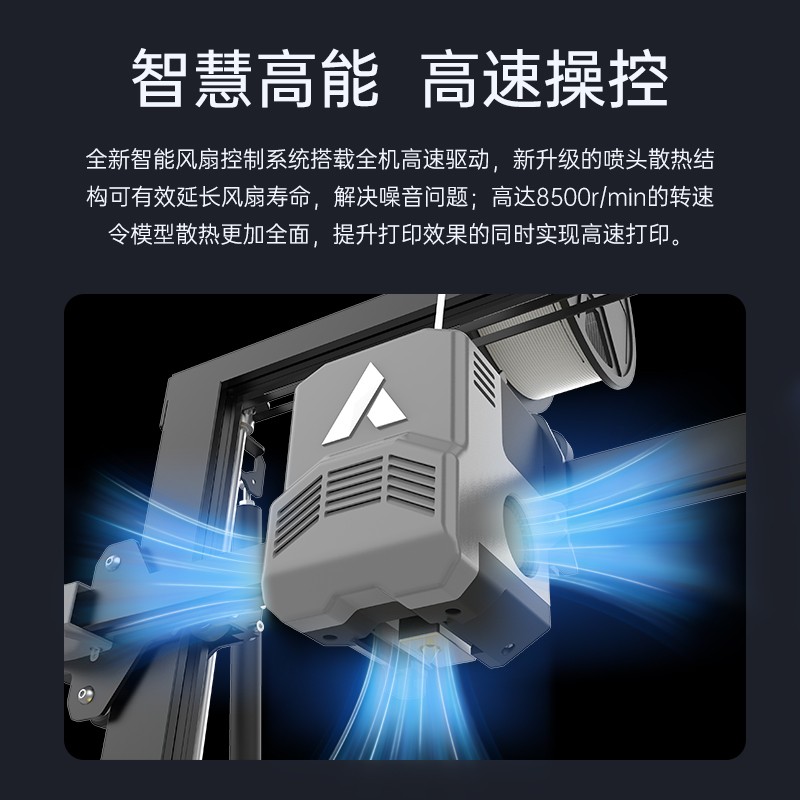 300*300*350mm最大成型空间·9.5倍放大挤出,使出料更均匀,成型更出色,搭载智能风扇控制系统,让高达8500r/min的转速降低噪音,还可以模型散热更全面的同时高速打印