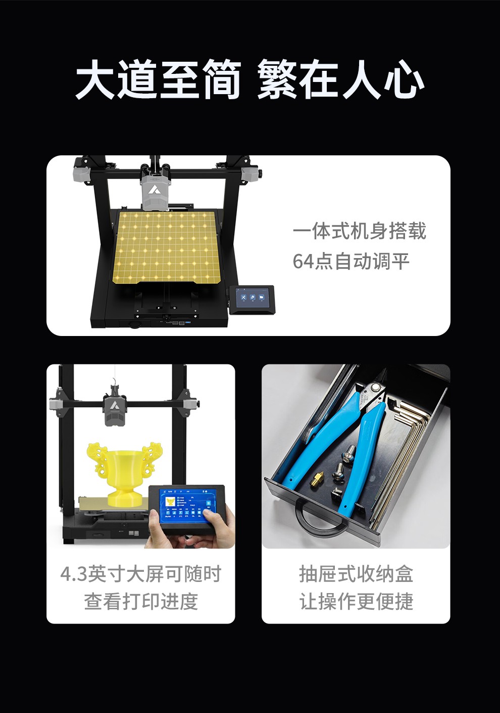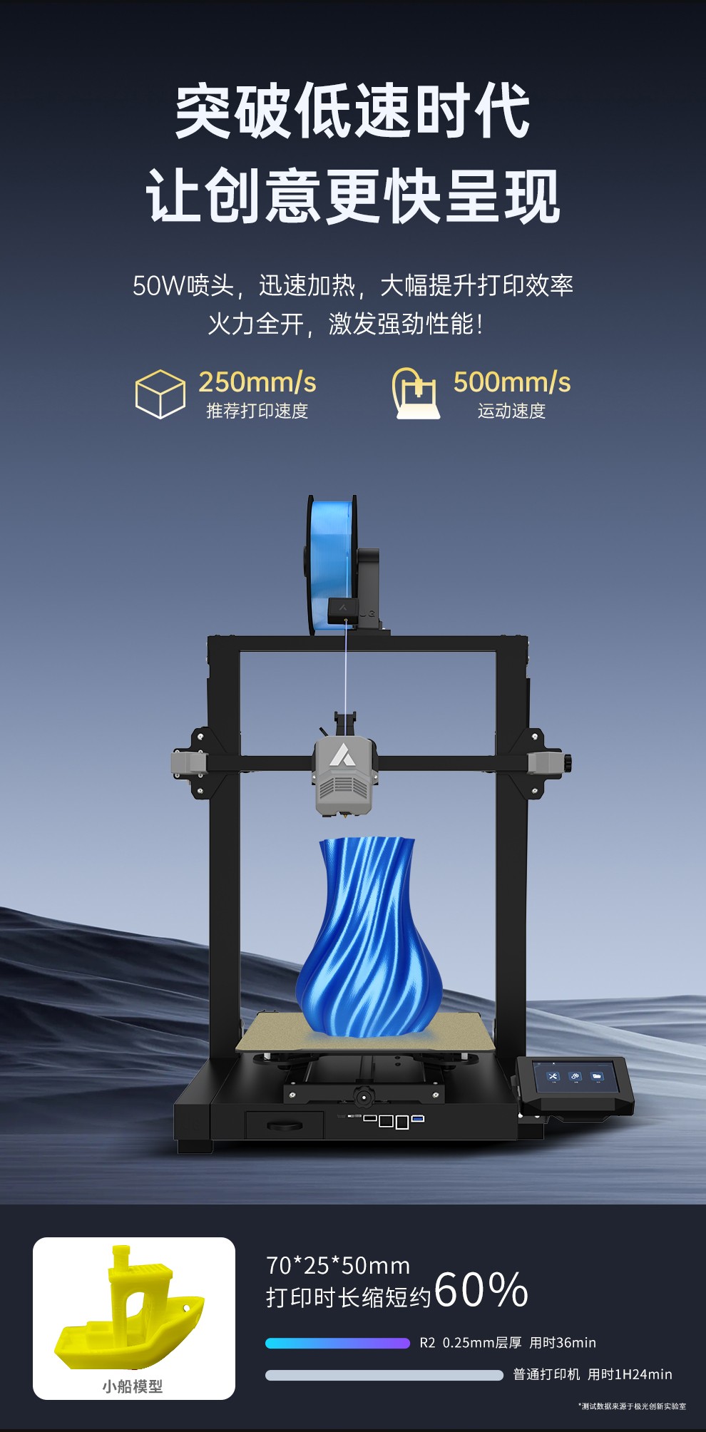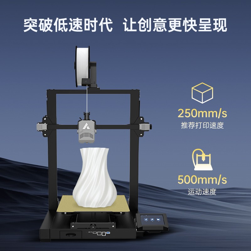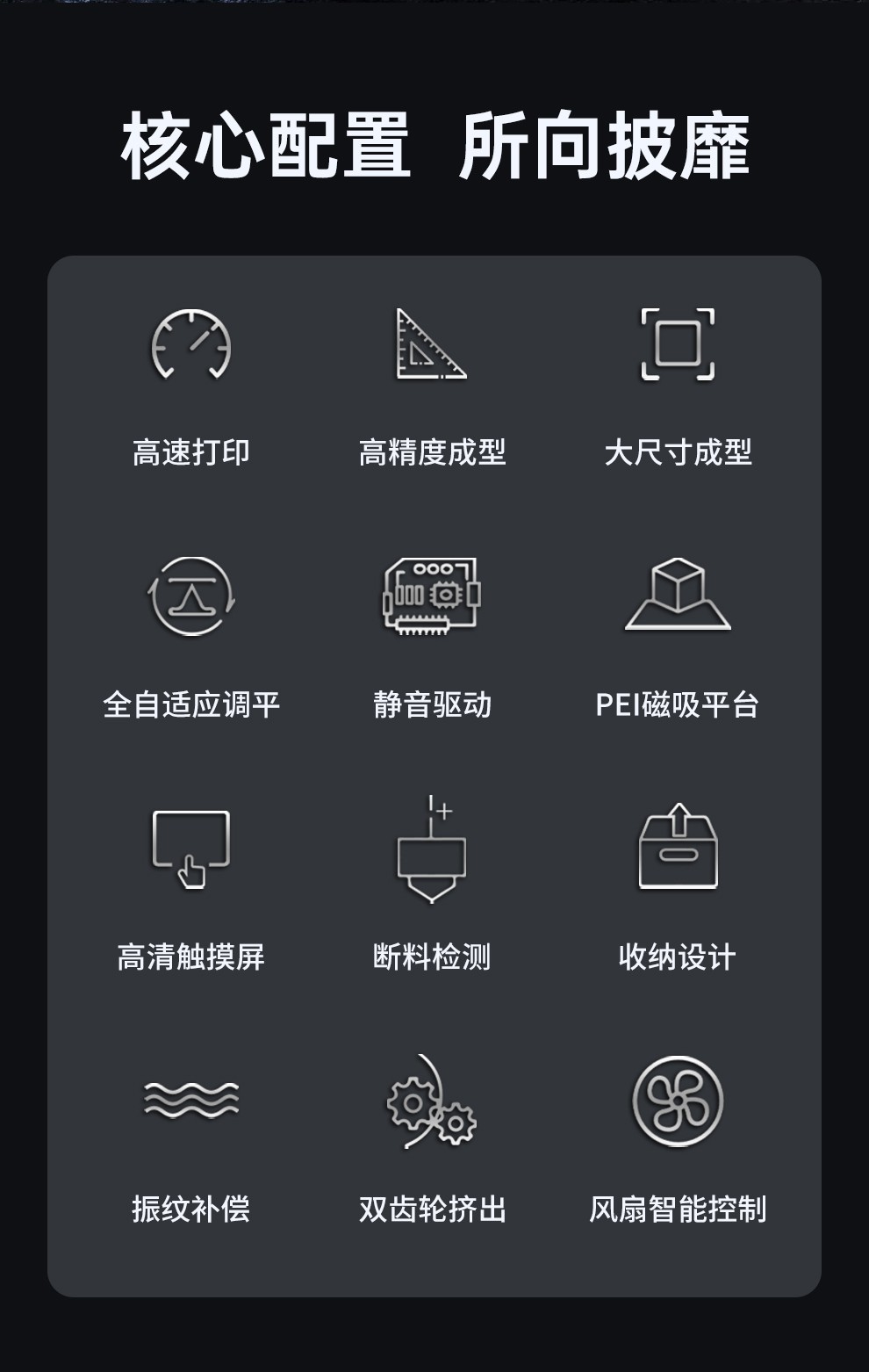 300*300*350mm最大成型空间·9.5倍放大挤出,使出料更均匀,成型更出色,搭载智能风扇控制系统,让高达8500r/min的转速降低噪音,还可以模型散热更全面的同时高速打印