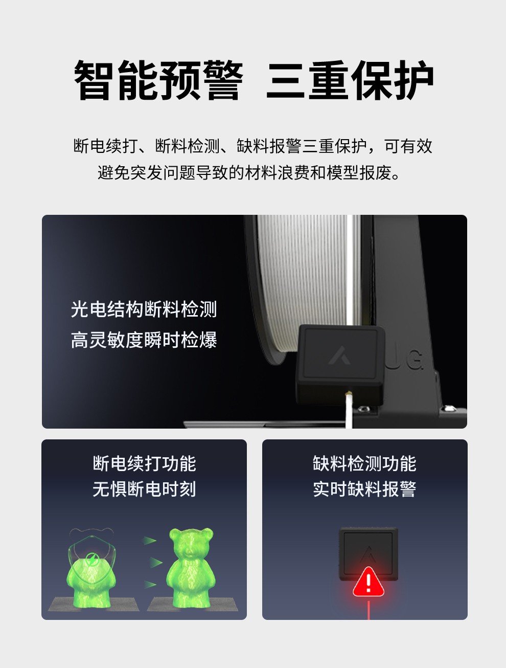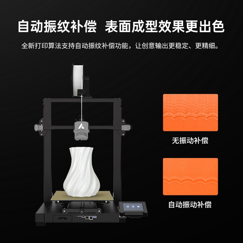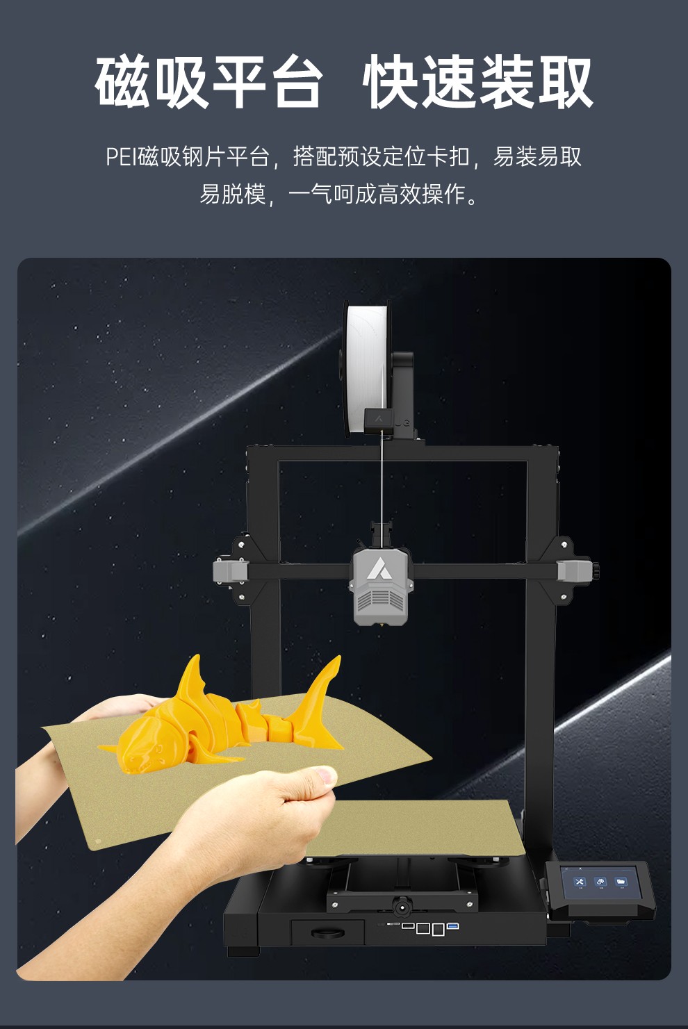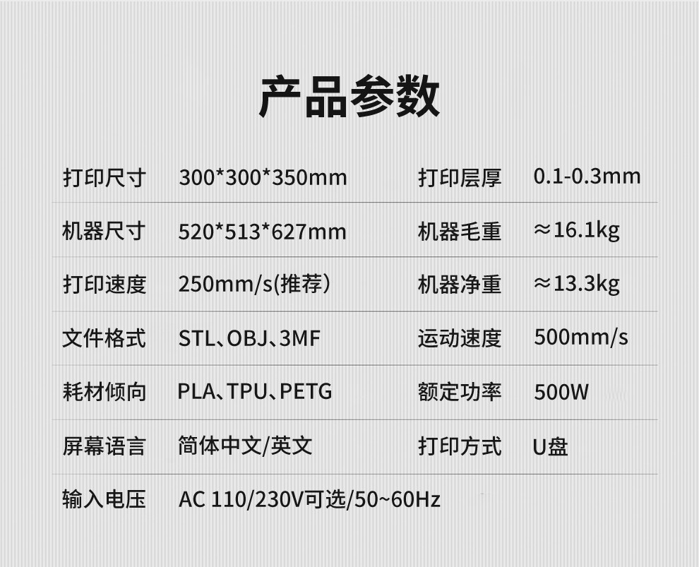 300*300*350mm最大成型空间·9.5倍放大挤出,使出料更均匀,成型更出色,搭载智能风扇控制系统,让高达8500r/min的转速降低噪音,还可以模型散热更全面的同时高速打印