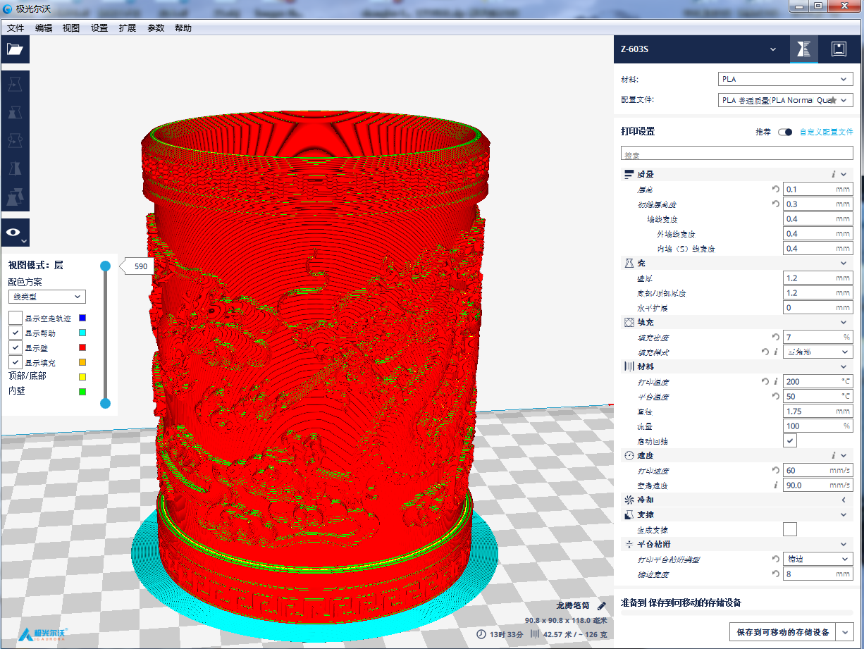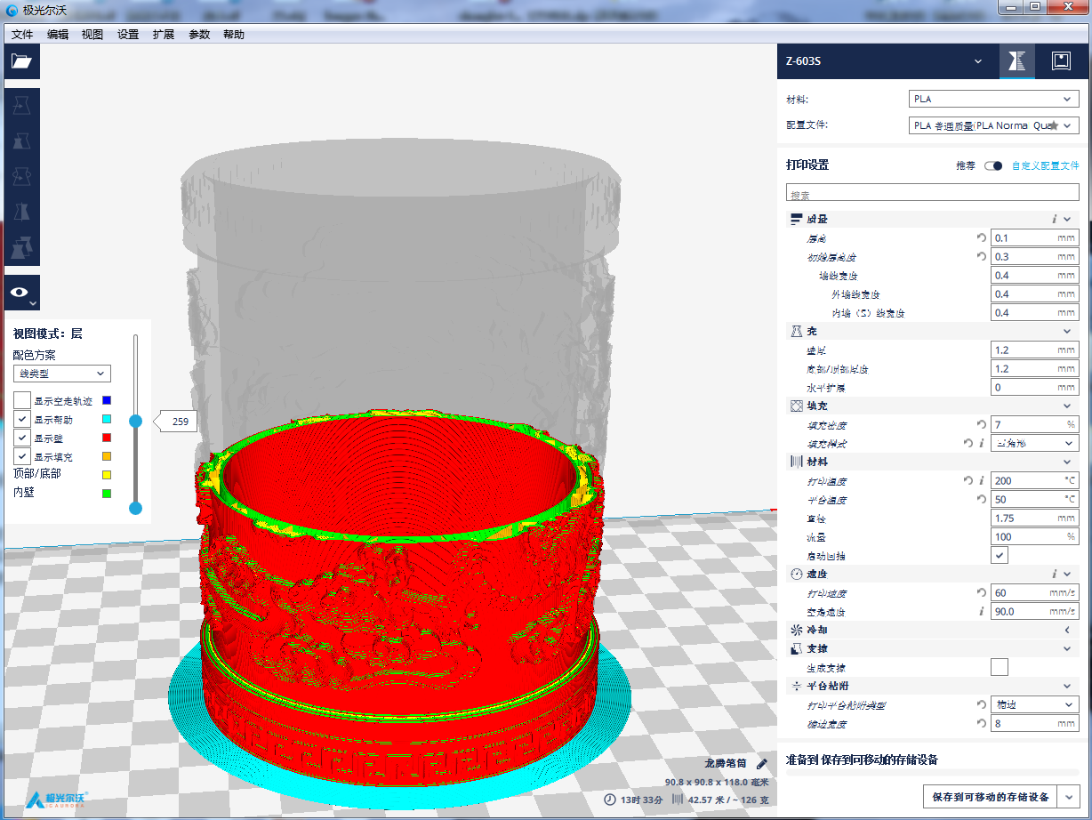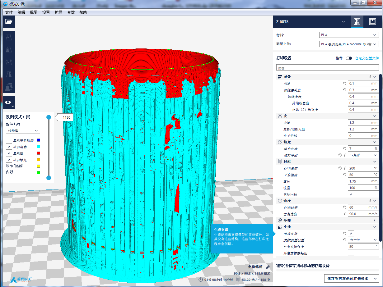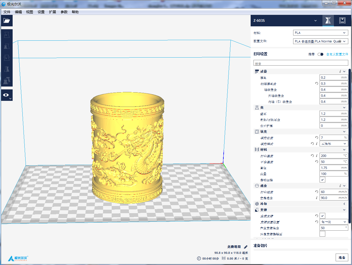 开始打印前,需要再次检查一遍模型信息,保证模型的各项参数是正确的。点击主菜单选择模型信息即可。其次就是要保证,模型不逾越机型本身的打印范围。比如机器的打印尺寸是280mm*180mm*180mm,那么我们要保证模型在这个尺寸范围内。(一般切片软件里都设置好了,不搞错机型就好,超出了就是灰色,显示的是无法切片或者提示文件过大无法切片)