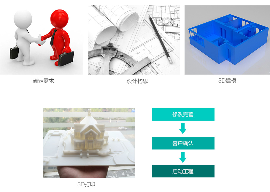 了解客户需求→构思设计→3D建?!?D打印出来→修改完善→客户确认→启动工程。